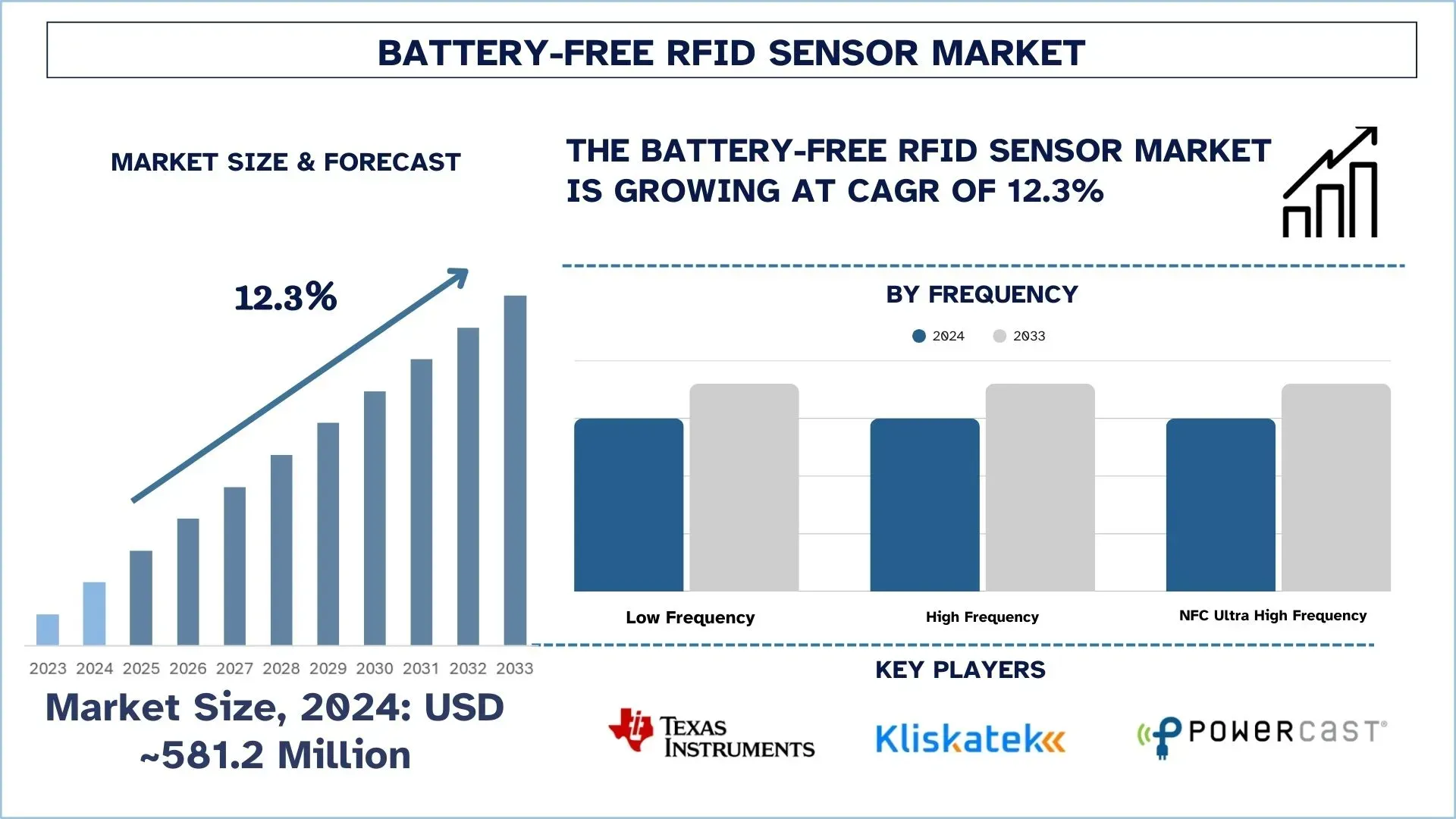 The Global Battery-Free RFID Sensor Market was valued at USD 581.2 Million in 2024 and is expected to grow to a strong CAGR of around 12.3% during the forecast period (2025-2033F)