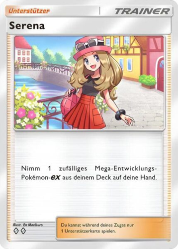 Serena, die charmante Pokémon-Trainerin, ist eine großartige Ergänzung für jedes Deck, das auf Mega-Pokémon-EX setzt. Durch ihre Unterstützung kannst du ein beliebiges Mega-Pokémon-EX aus deinem Deck direkt auf deine Hand nehmen, was dir strategische Flexibilität verleiht und dir hilft, deine Spielstrategie optimal umzusetzen. Ihre Fähigkeit macht sie zu einem wertvollen Spielzug, um wichtige Pokémon schnell verfügbar zu machen und das Spiel zu kontrollieren.