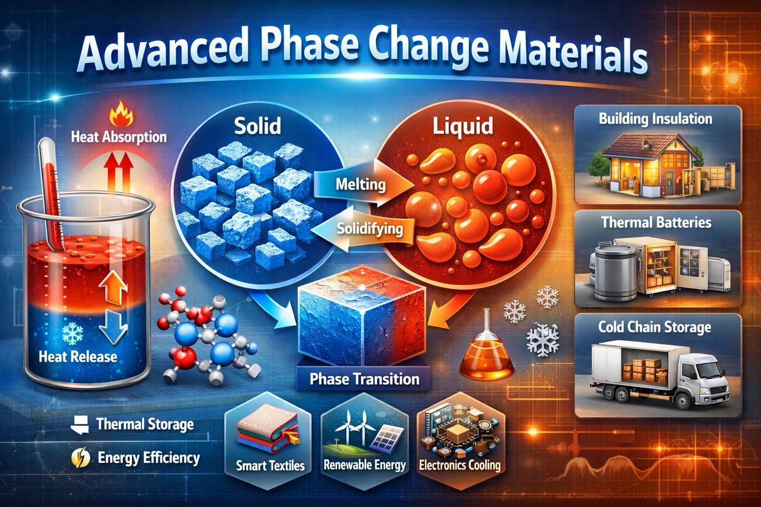 Advanced phase change materials are used for thermal energy storage, building temperature regulation, HVAC efficiency, electronics cooling, and temperature controlled packaging.