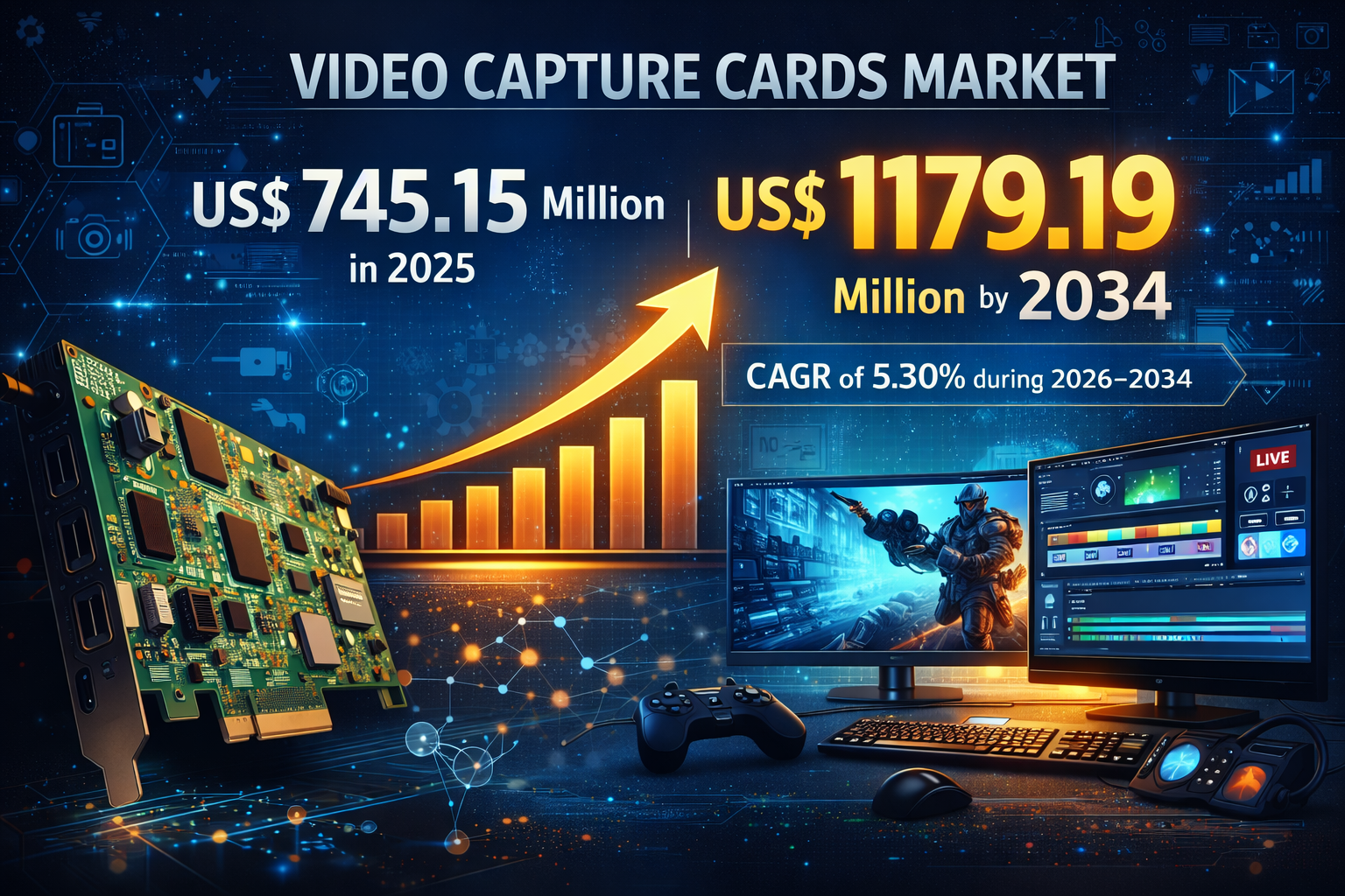 According to The Insight Partners, The  video capture cards market  is projected to grow from US$ 745.15 million in 2025 to US$ 1,179.19 million by 2034, reflecting a compound annual growth rate of 5.3% between 2026 and 2034 . This growth is fueled by rising demand for high-resolution video streaming, gaming, professional broadcasting, and other applications that require advanced video capture solutions.