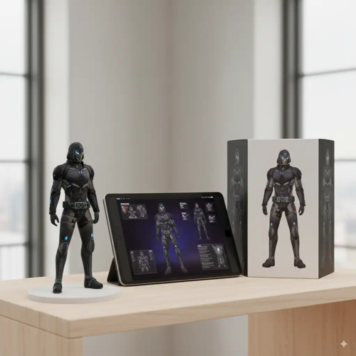 Step into a futuristic realm with a 1:4 scale cyberpunk figurine illuminated by neon lights, positioned on a glowing glass computer desk. Its hexagonal base shines with embedded LED lights. A holographic screen showcases a high-poly 3D render of the figure, while a sleek black metallic packaging box with luminescent stripes and original artwork stands nearby, adorned with two-dimensional flat illustrations.