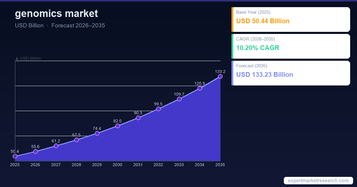The genomics market is expected to grow at a CAGR of 10.20% during the forecast period of 2026-2035, with values likely to reach USD 133.23 Billion by 2035. The market was valued at USD 50.44 Billion in 2025, driven by advancements in genetic research and personalized medicine across the globe.