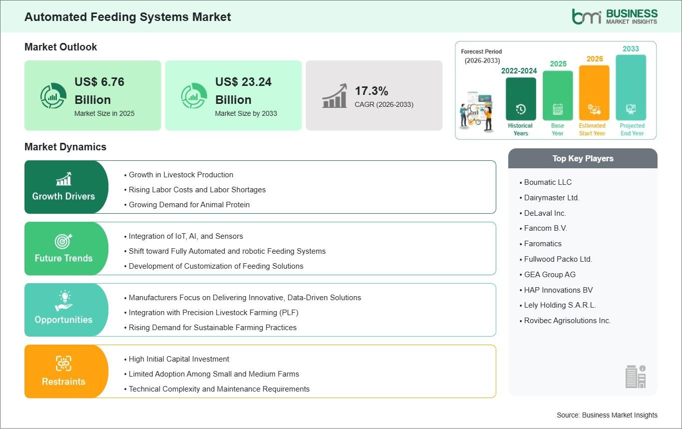 According to the Business Market Insights The Global Automated Feeding Systems Market is experiencing rapid expansion, driven by the increasing adoption of precision livestock farming and the need to improve operational efficiency in agriculture. According to recent industry analysis, the market was valued at US$ 6.76 billion in 2025 and is projected to reach US$ 23.24 billion by 2033, growing at a robust CAGR of 17.3% during 2026–2033. This growth reflects the rising demand for automation technologies that enhance feed efficiency, reduce labor dependency, and improve livestock productivity.
