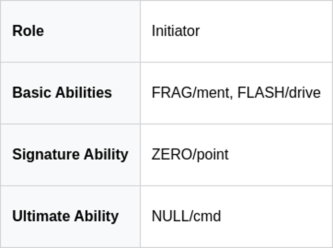 Il apporte trois fumigènes déployables pour couper les lignes de vue, un incendiaire pour refuser l'espace, une balise de stimulation qui accélère les alliés à proximité, et une frappe orbitale ultime qui bombarde une zone ciblée.